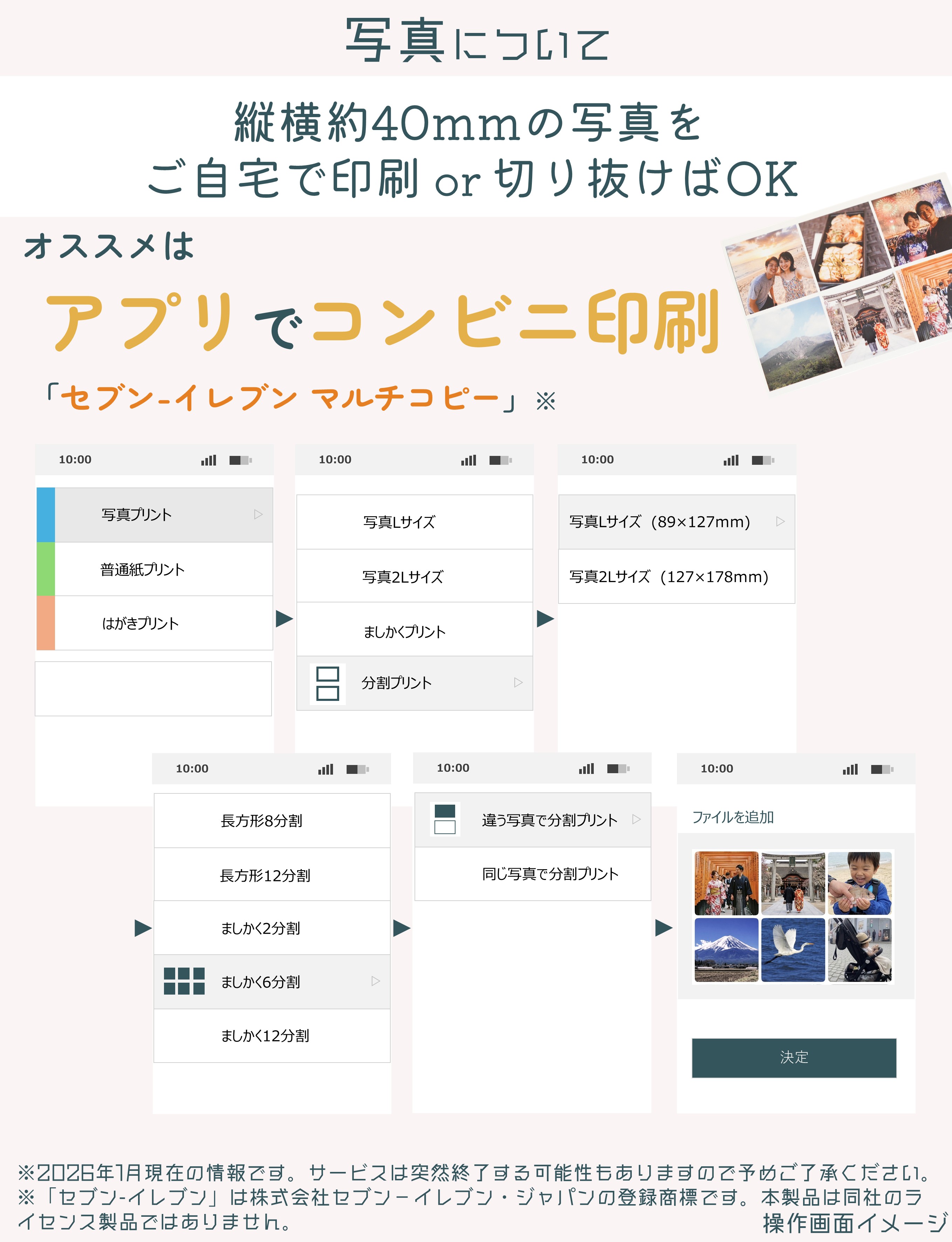 縦横約40mmの写真をご自宅で印刷、または切り抜けばOK。
